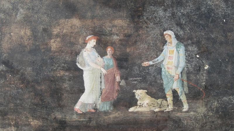 Il tema predominante degli affreschi sembra essere l’eroismo, con rappresentazioni di eroi e divinità legati alla guerra di Troia. Tra le figure che decorano il salone, spiccano Elena e Paride, quest’ultimo anche noto come “Alexandros” in un’iscrizione greca, insieme alla tragica figura di Cassandra e al suo accompagnatore Apollo. Cassandra, nota per il suo dono di preveggenza e per il destino che la condanna a essere ignorata, incarna il tema del destino e della possibilità umana di cambiarlo, un tema affascinante che permea il ricco tessuto mitologico dell’antica Pompei.